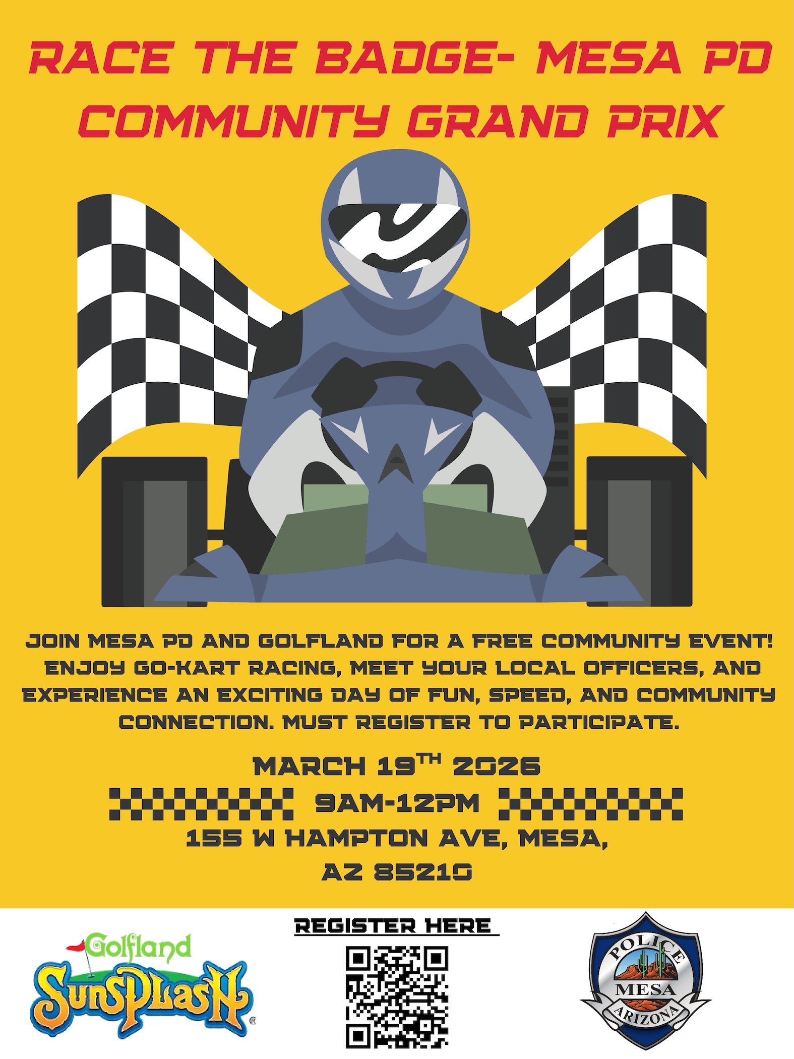 The Mesa Police Department is hosting the Mesa PD Grand Prix, a community engagement event scheduled for March 19 from 9:00 a.m. to 12:00 p.m. at Golfland Sunsplash. The free event invites residents, families, and children to race go-karts alongside police officers while enjoying a morning focused on fun, connection, and community building.